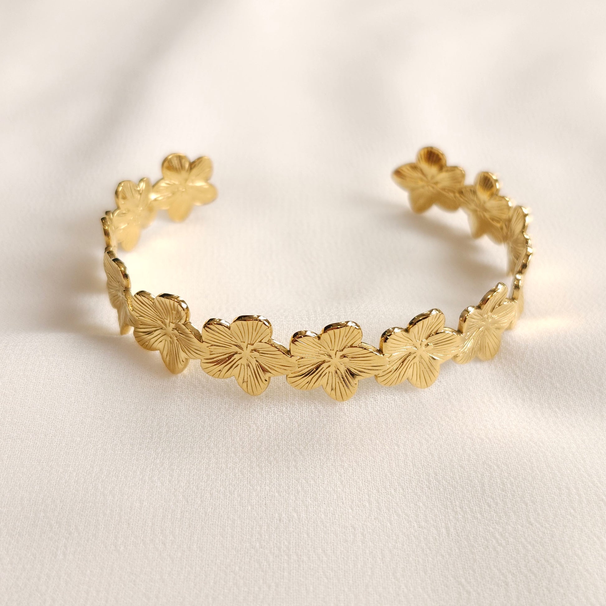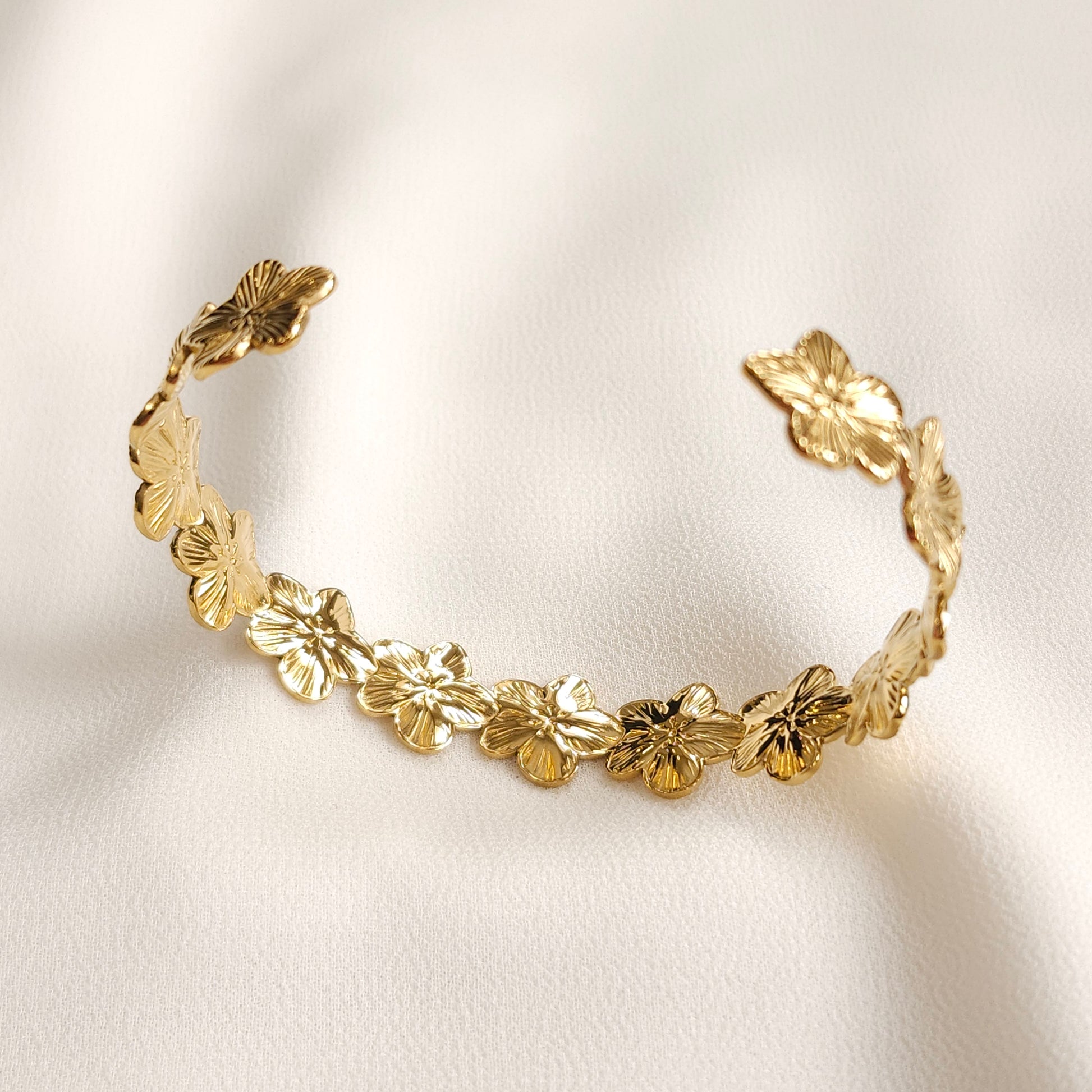 A delicate gold-plated floral cuff with engraved petal details for a soft, feminine touch. Lightweight, adjustable, and perfect for everyday wear or special occasions. A timeless piece that adds effortless elegance to any look.