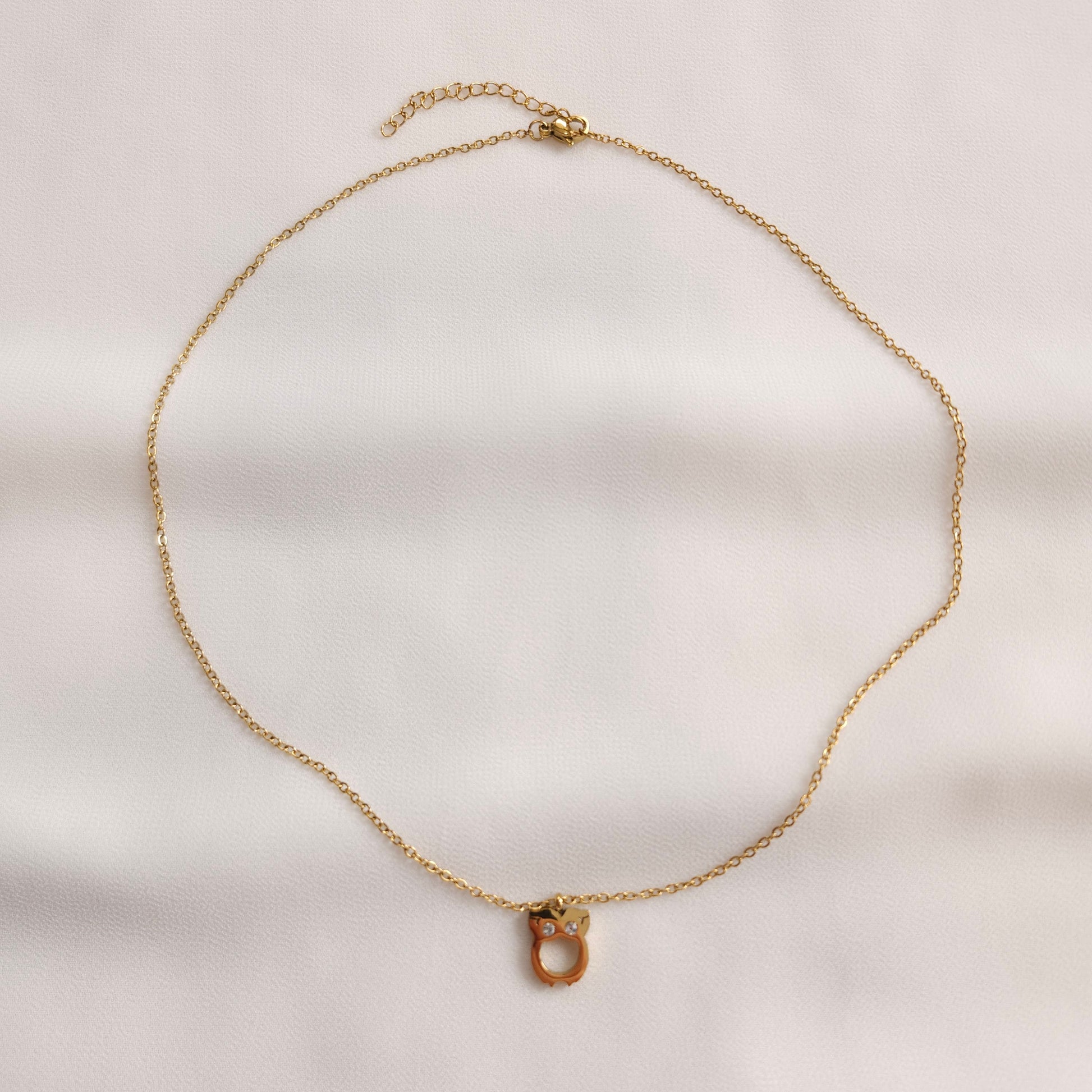 This elegant owl necklace adds a subtle touch of charm and sparkle to your everyday look. Crafted in gold-plated stainless steel, it features a smooth, modern silhouette accented with delicate crystal details. Designed to be lightweight yet eye-catching, it layers beautifully or stands out on its own. Tarnish-resistant and made for daily wear, it’s a timeless piece you’ll reach for again and again.