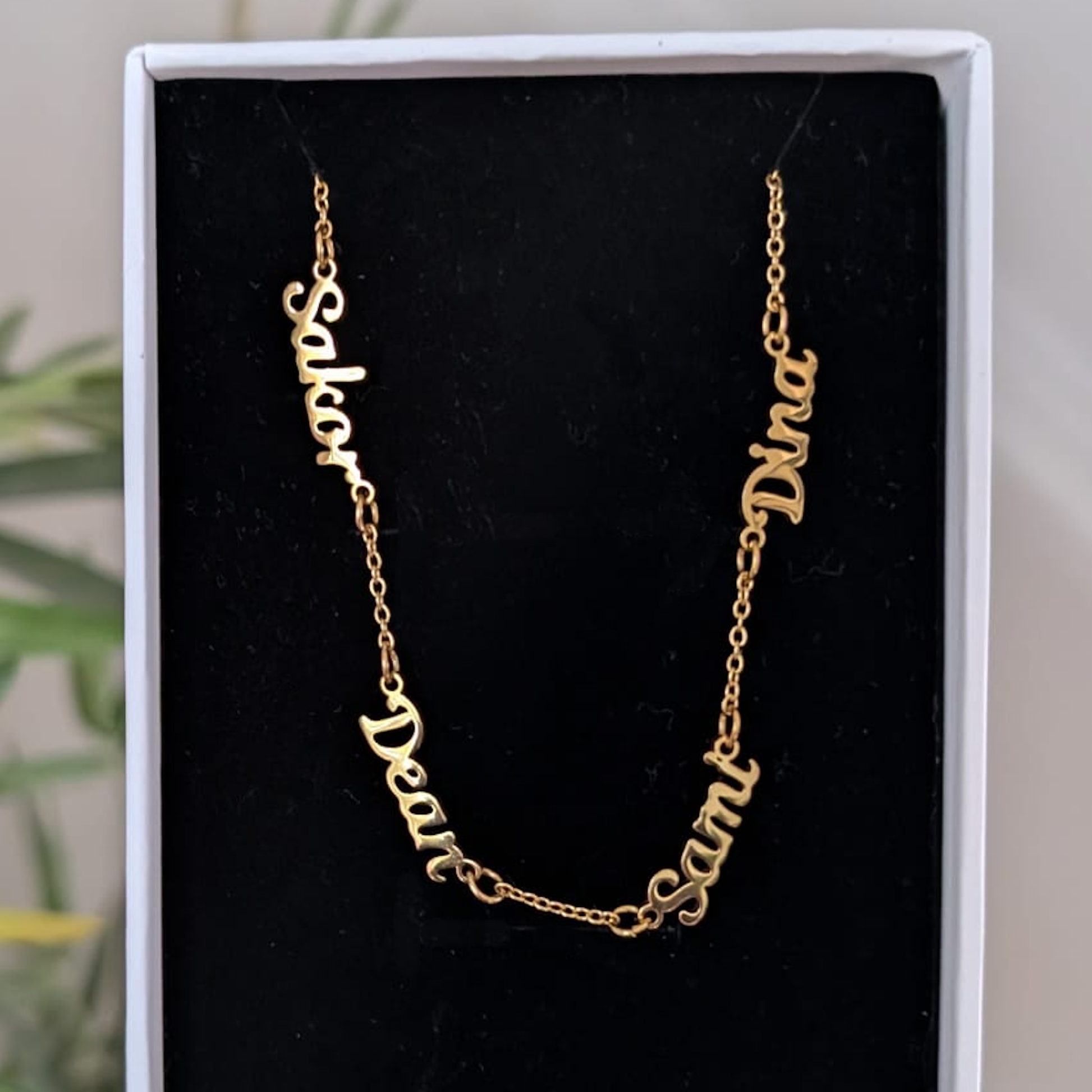 Elevate your everyday look with this stunning Personalized Multiple Name Necklace – a timeless piece crafted from high-quality stainless steel and finished with a luxurious 18K gold plating. Your custom necklace celebrates your loved ones' identities with elegance and grace. This necklace makes for a meaningful gift or a stylish statement piece.