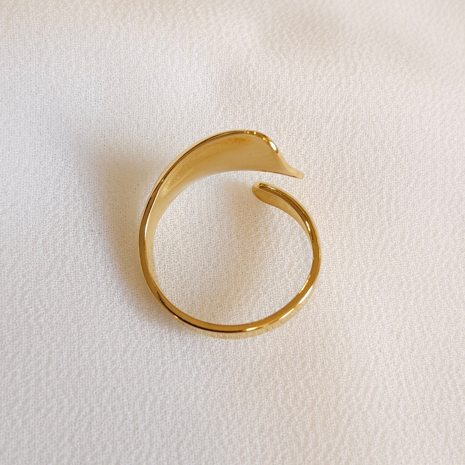 Elegant and contemporary, the Sculpted Ring features a fluid, asymmetric design that wraps gracefully around the finger. Crafted with a high-polish gold finish, it's a statement piece that blends minimalism with bold artistry.
